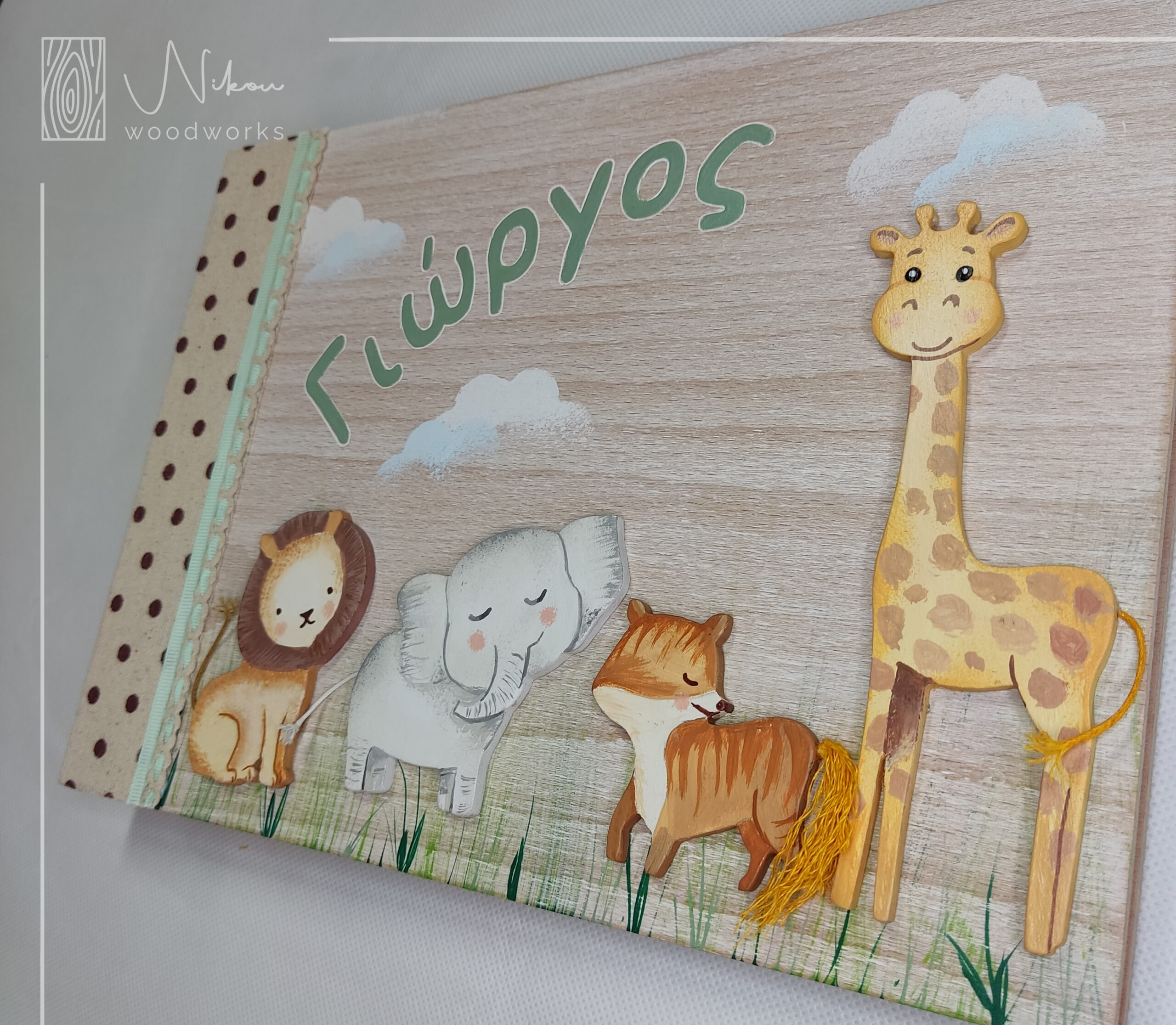 Ξύλινο χειροποίητο άλμπουμ – ευχολόγιο με πρόσθετα ζωάκια του δάσους και το όνομα, όλα ζωγραφισμένα στο χέρι.