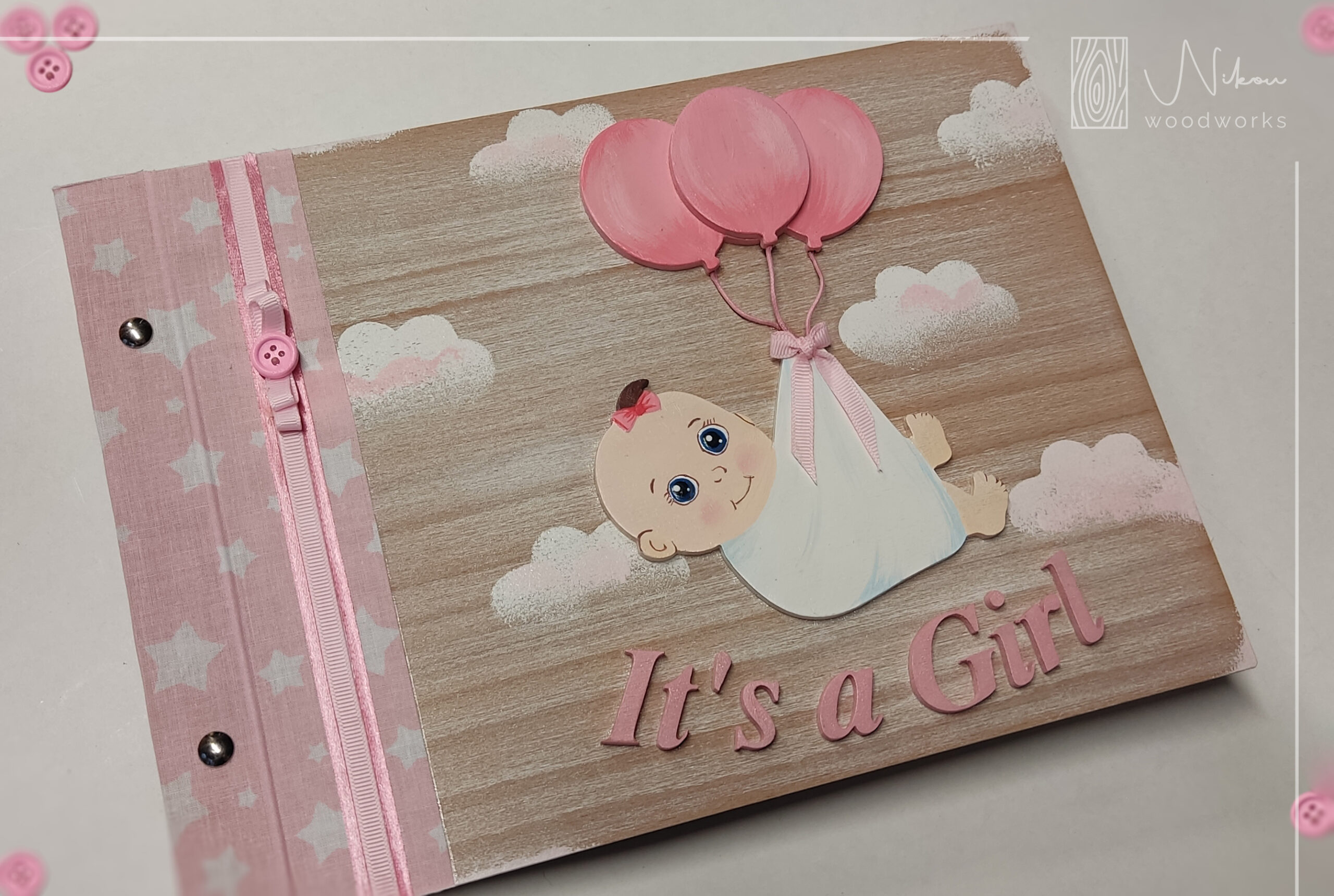 Ένα ευχολόγιο – άλμπουμ με νεογέννητο και μπαλόνια.