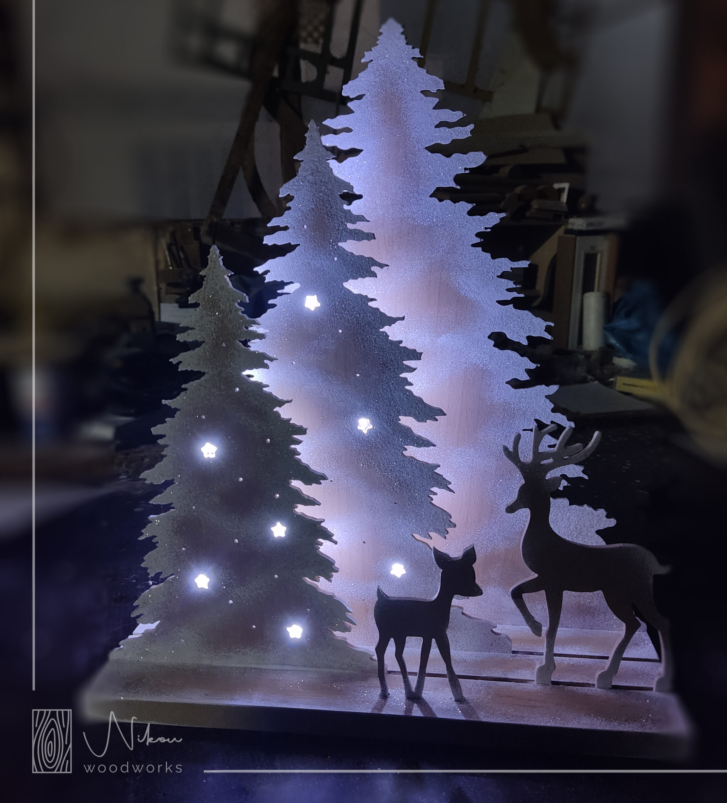 Ξύλινη χριστουγεννιάτικη σύνθεση με δέντρα, ελαφάκια και φωτάκια led μπαταρίας.