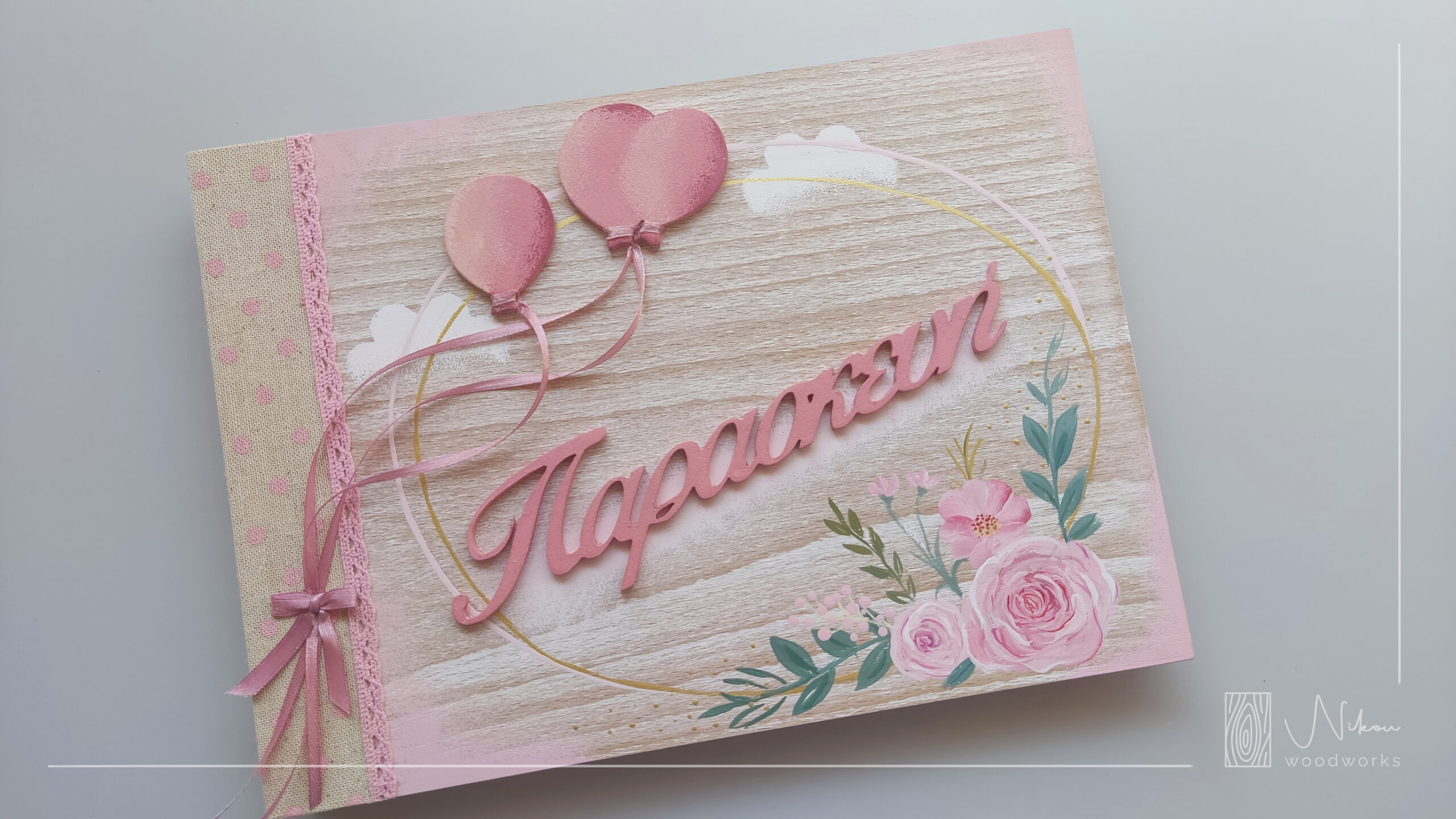 Ένα ευχολόγιο – άλμπουμ εμπνευσμένο από το θέμα της βάφτισης της μικρής Παρασκευής με λουλούδια, μπαλόνια και το όνομα του παιδιού. Μπορείτε και εσείς να παραγγείλετε το δικό σας στα χρώματα και το όνομα που επιθυμείτε.