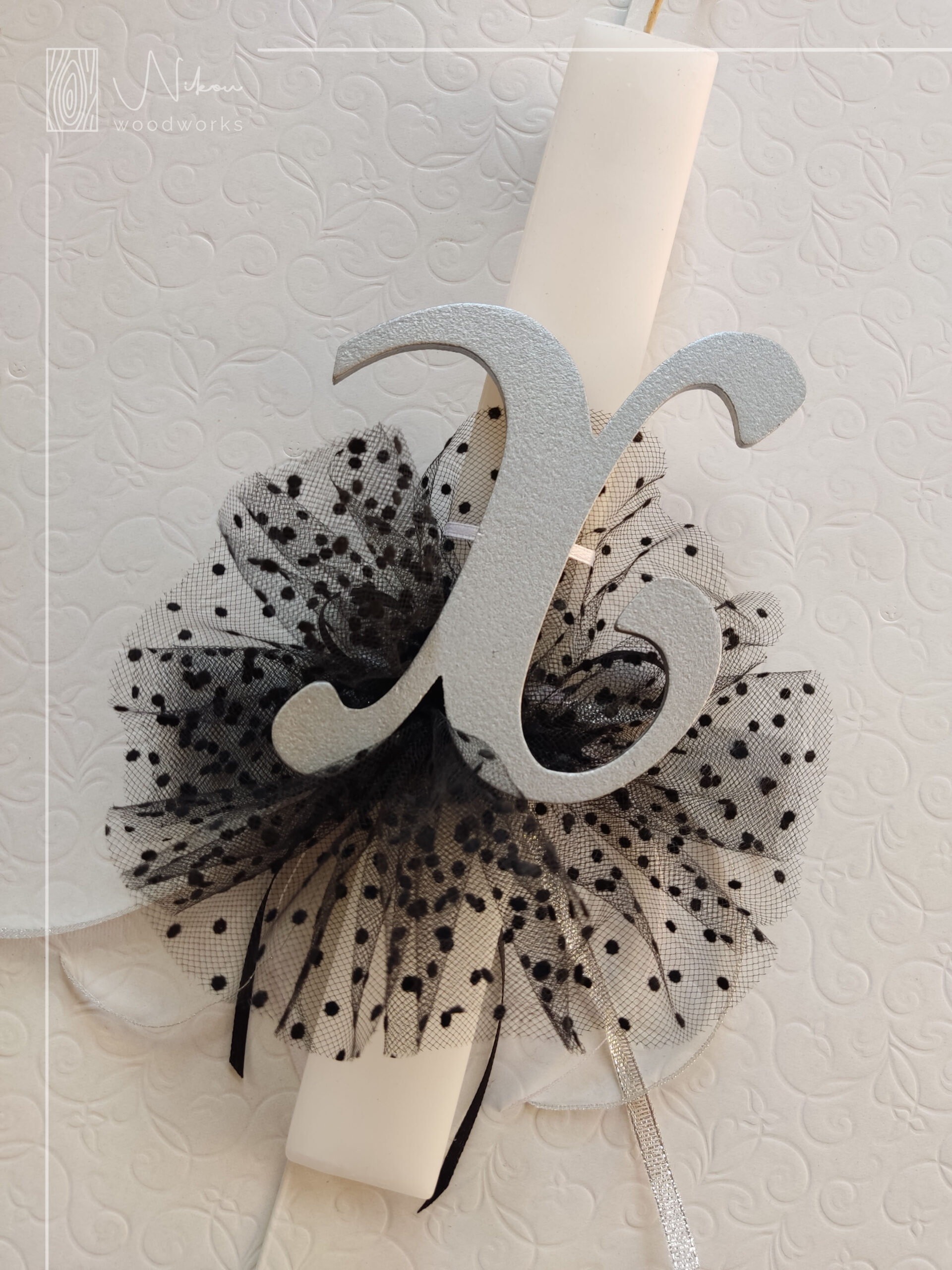 Μοδάτη ροκ δημιουργία για τα κορίτσια μας! Λαμπάδα με ξύλινο μονόγραμμα-μαγνητάκι με μαύρο τούλι!