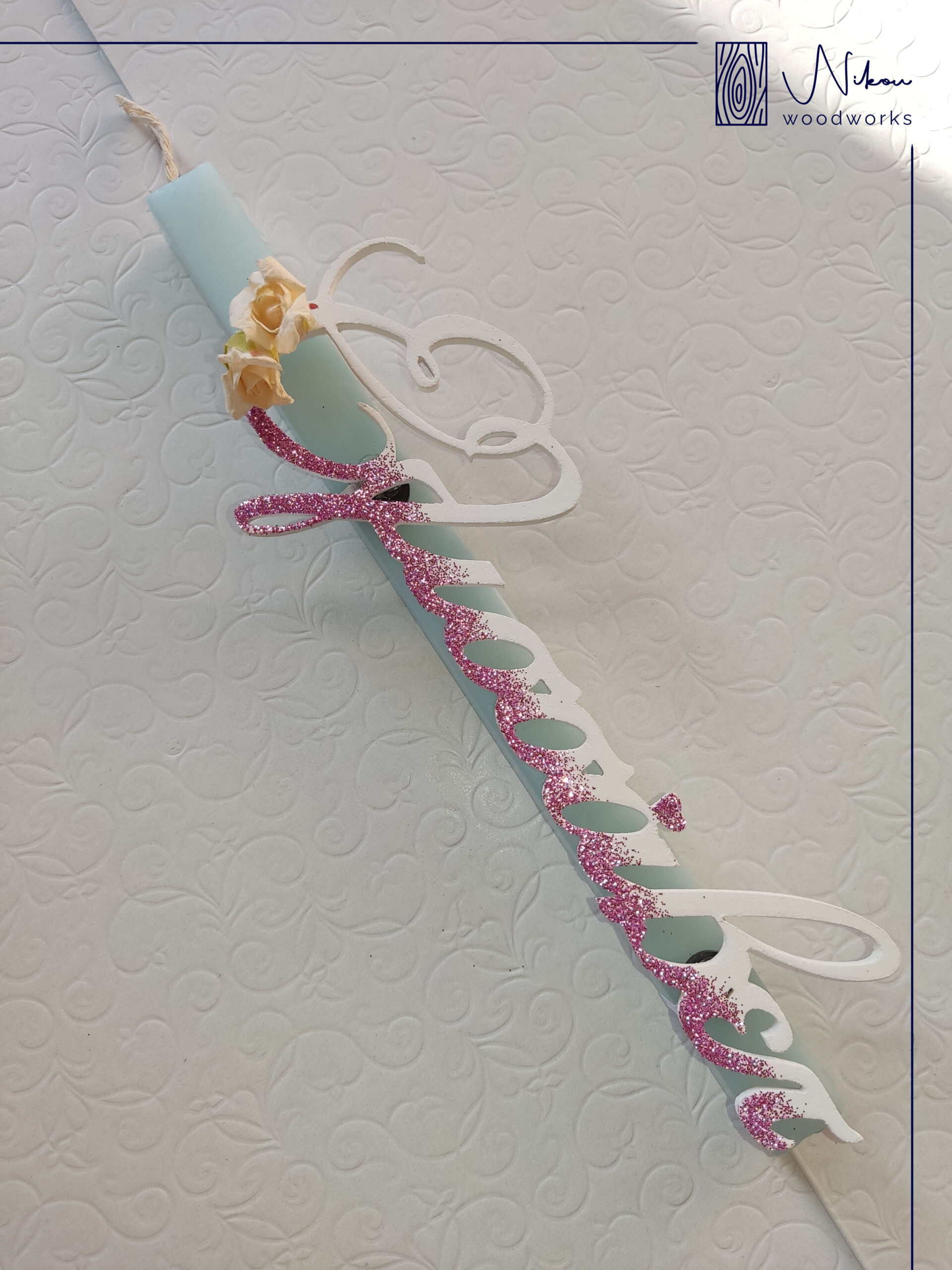 Λαμπάδα με ξύλινο όνομα και μικρά μαγνητάκια στην πίσω όψη.