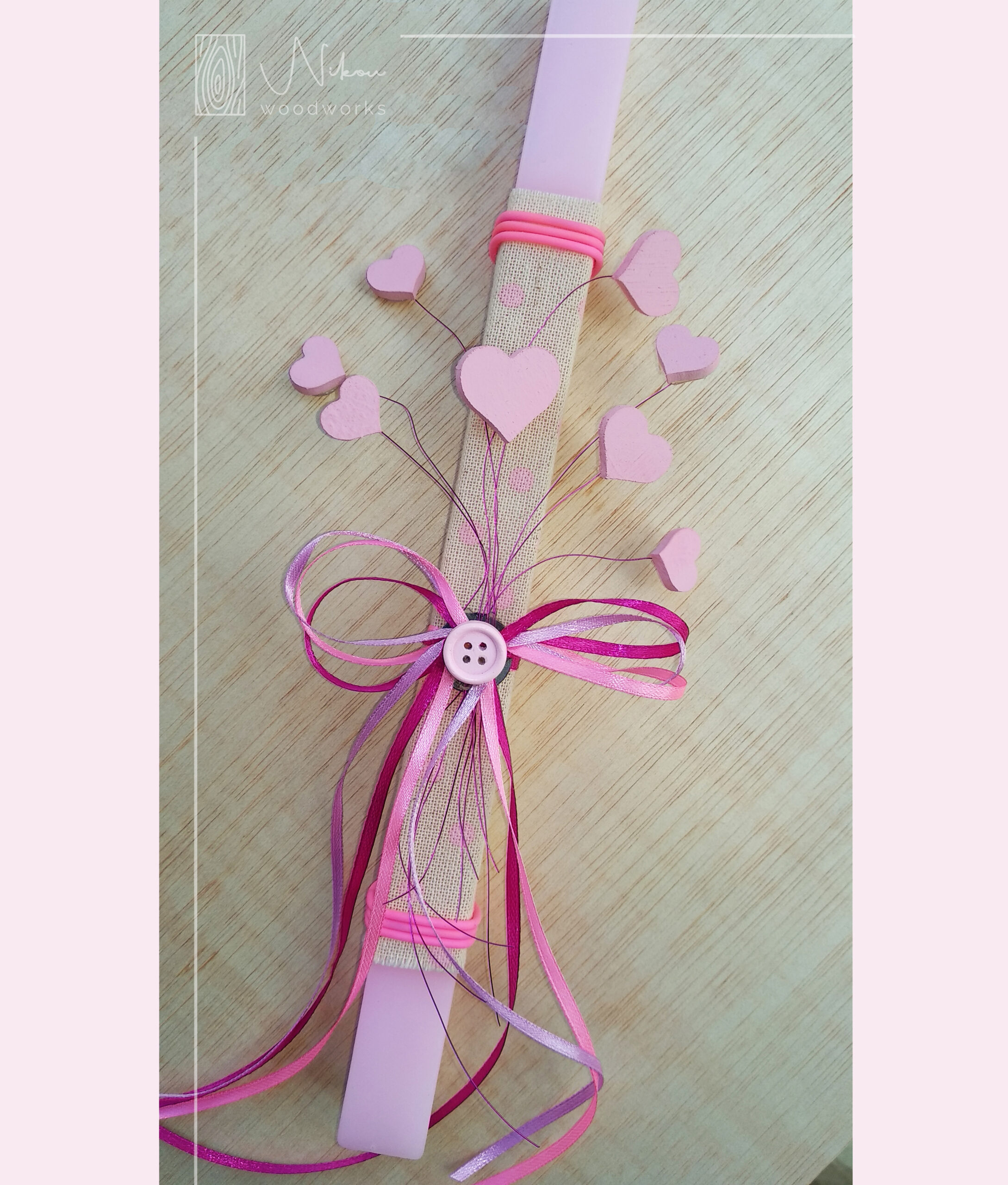 Λαμπάδα μπουκέτο με ξύλινες καρδιές και μαγνητάκι στην πίσω πλευρά!