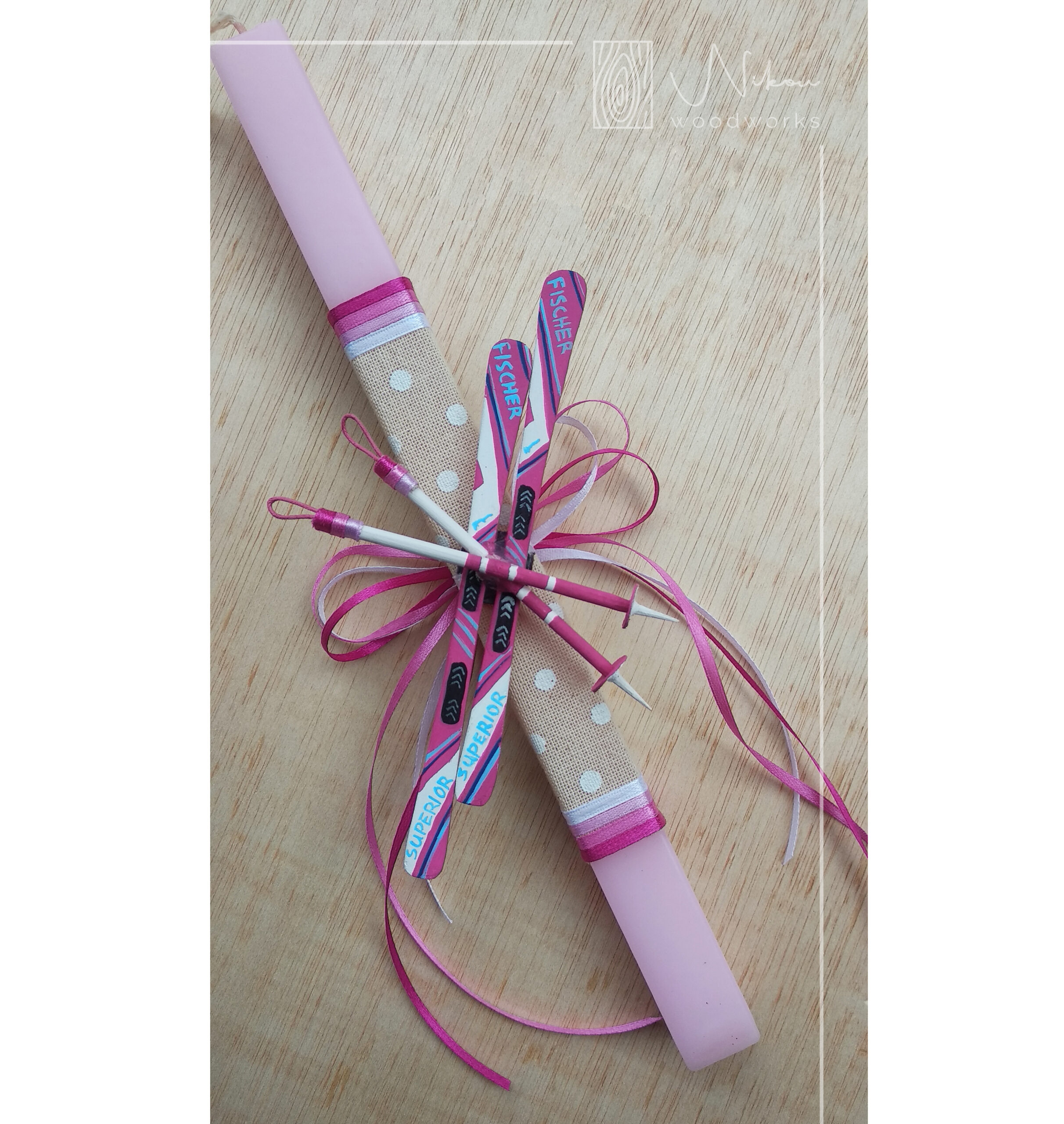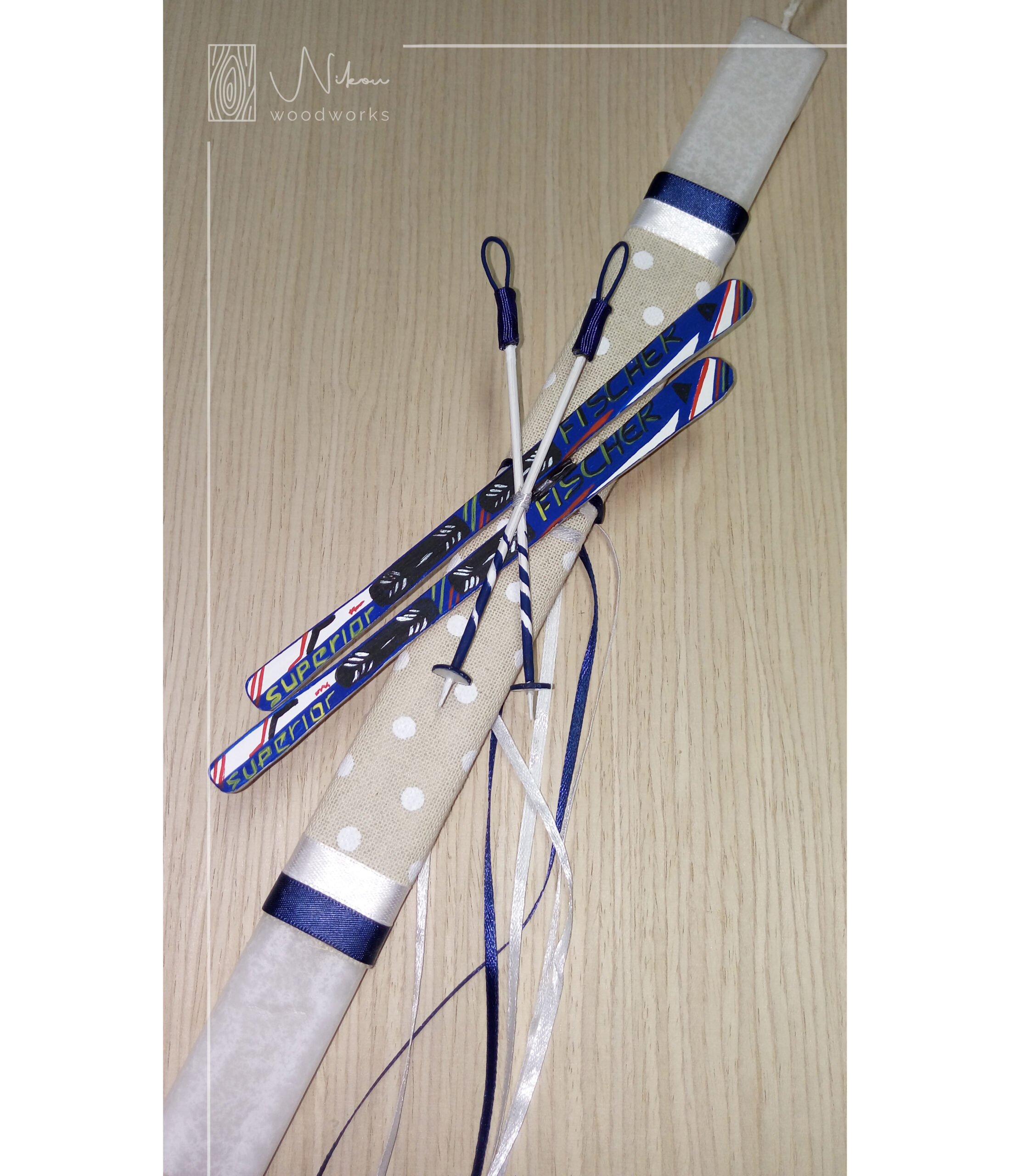 Λαμπάδα ξύλινα χειροποίητα χιονοπέδιλα και μπαστούνια του ski με μαγνητάκι στην πίσω πλευρά!