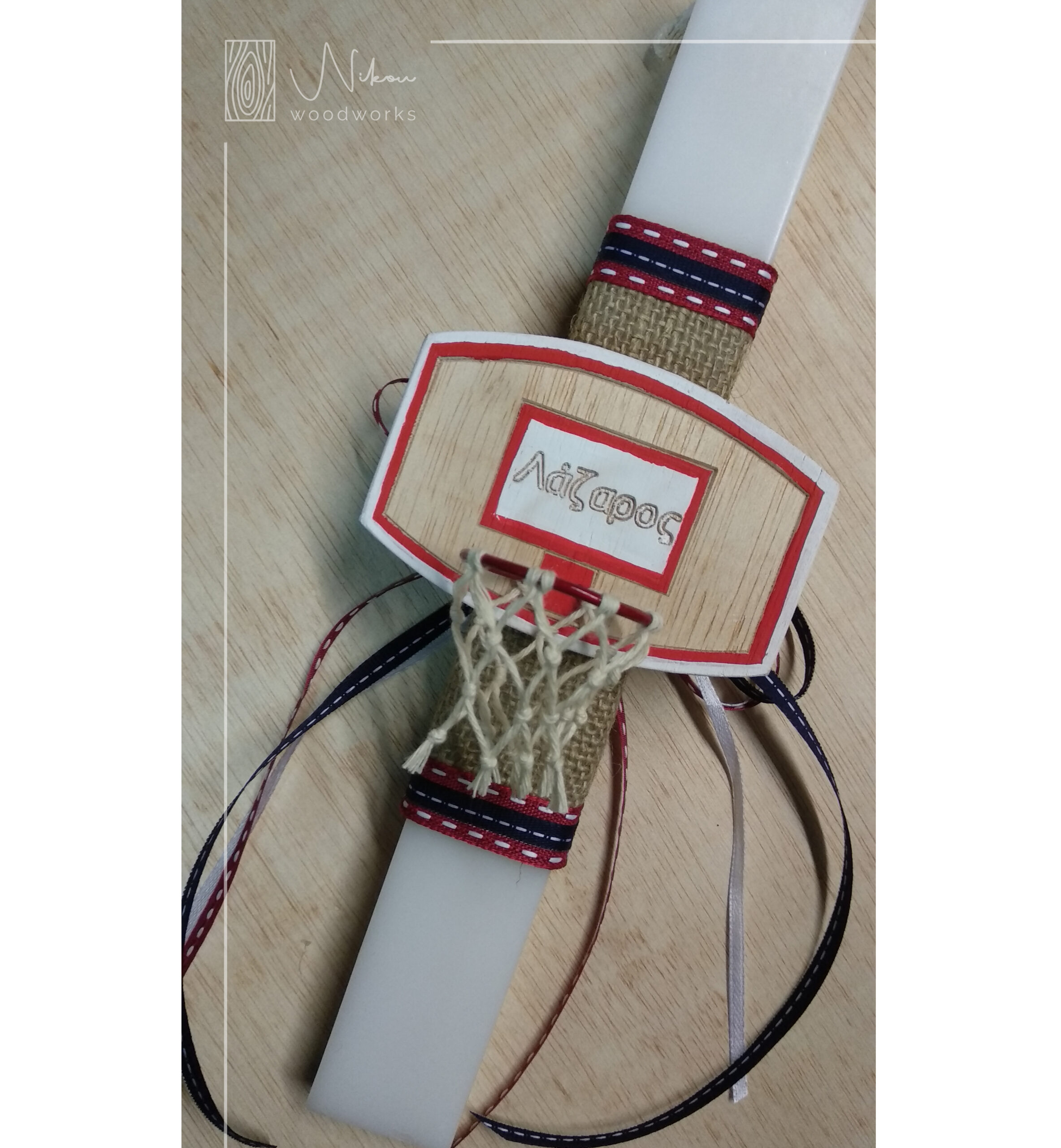 Λαμπάδα ξύλινη χειροποίητη μπασκέτα με στεφάνι, πλεκτό δίχτυ και μαγνητάκι στην πίσω πλευρά!
