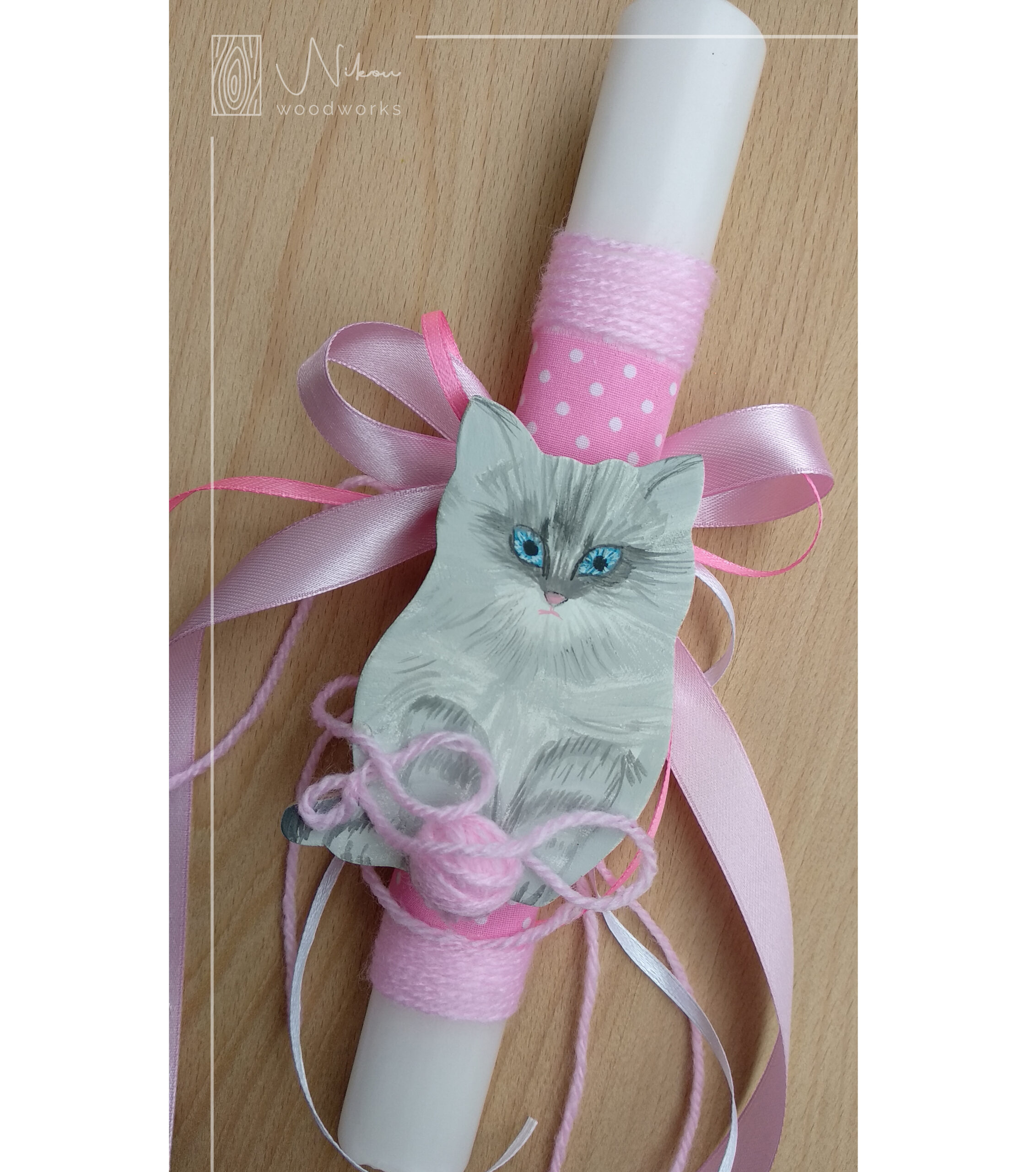 Λαμπάδα με ξύλινο γατάκι, με μαγνητάκι, ζωγραφισμένη στο χέρι και στολισμένη με συνθετικό νήμα!