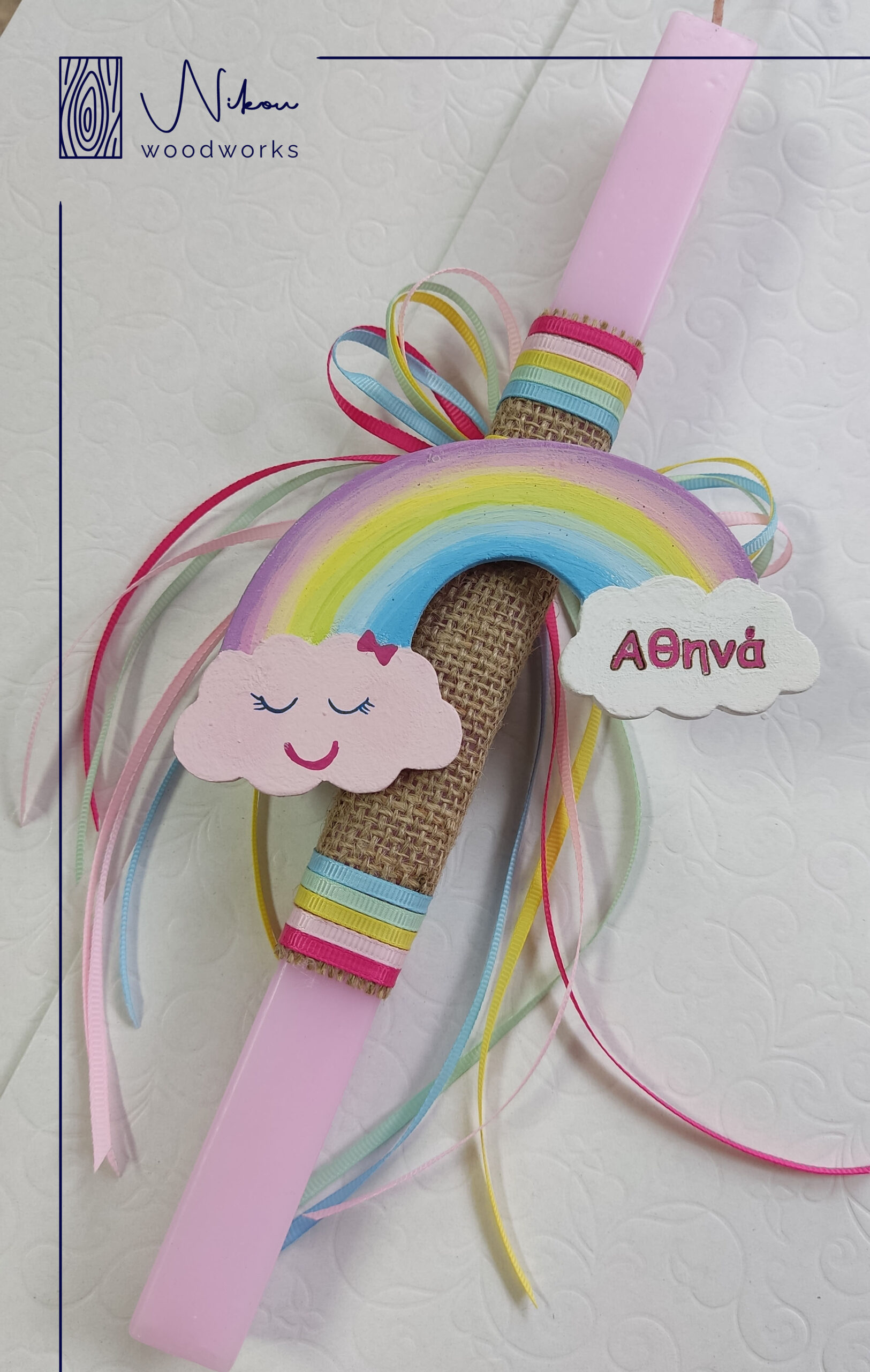 Χαριτωμένη πολύχρωμη χειροποίητη λαμπάδα ουράνιο τόξο με όνομα.
