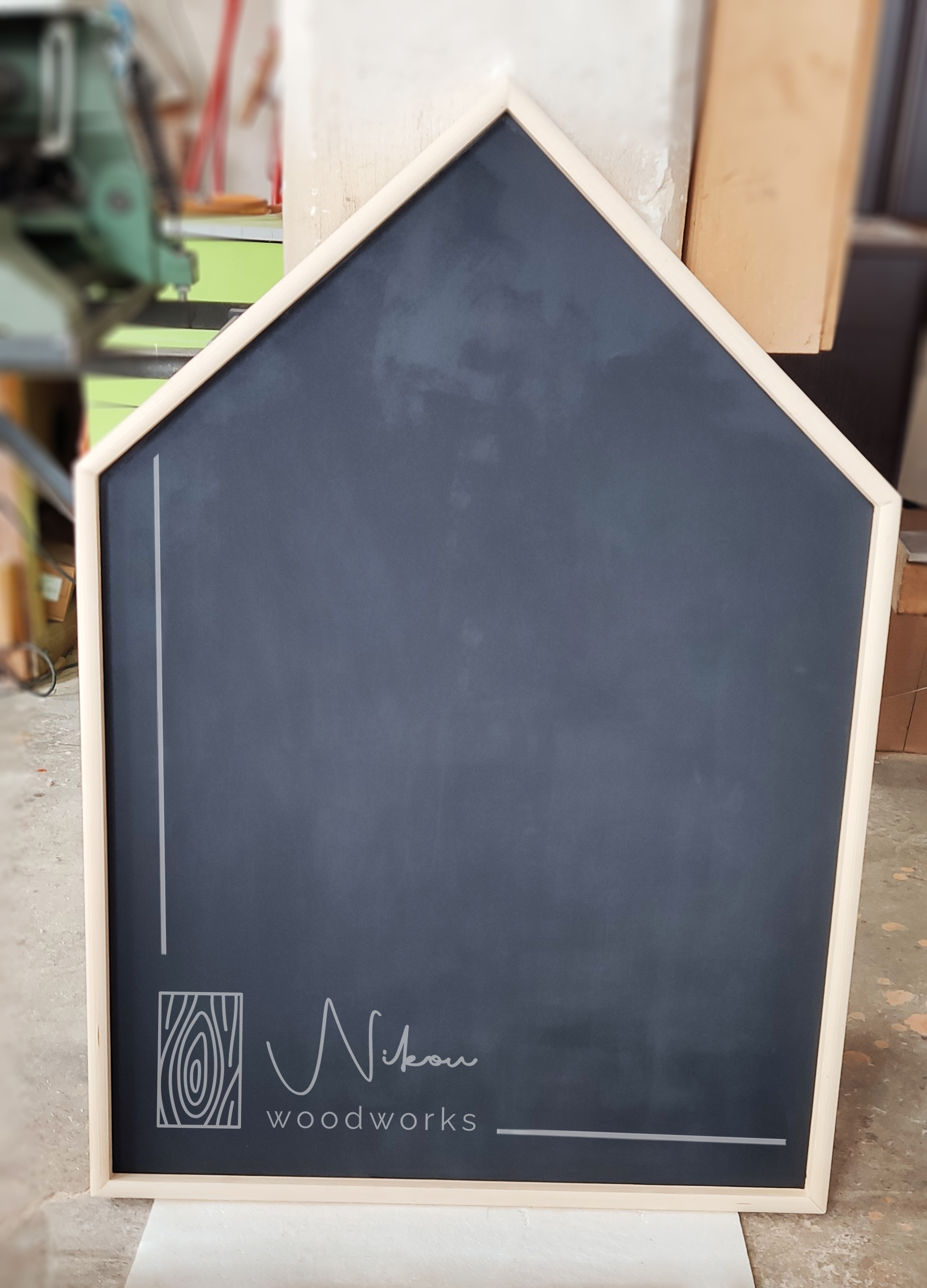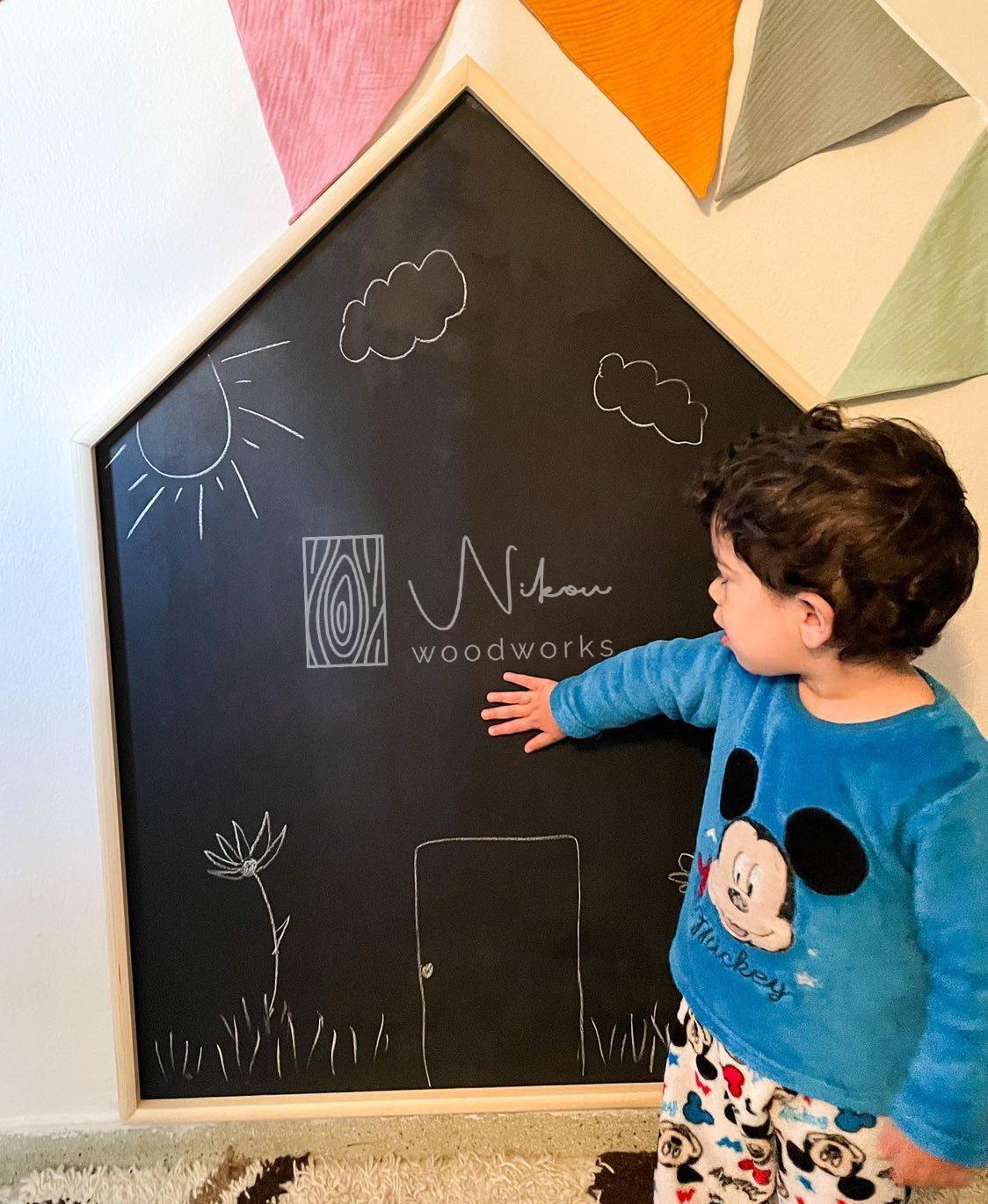 Ξύλινος μαυροπίνακας για κιμωλία ή μαρκαδόρο κιμωλίας, σε σχήμα σπιτάκι για την διακόσμηση του παιδικό δωματίου αλλά και για ατελείωτο παιχνίδι.