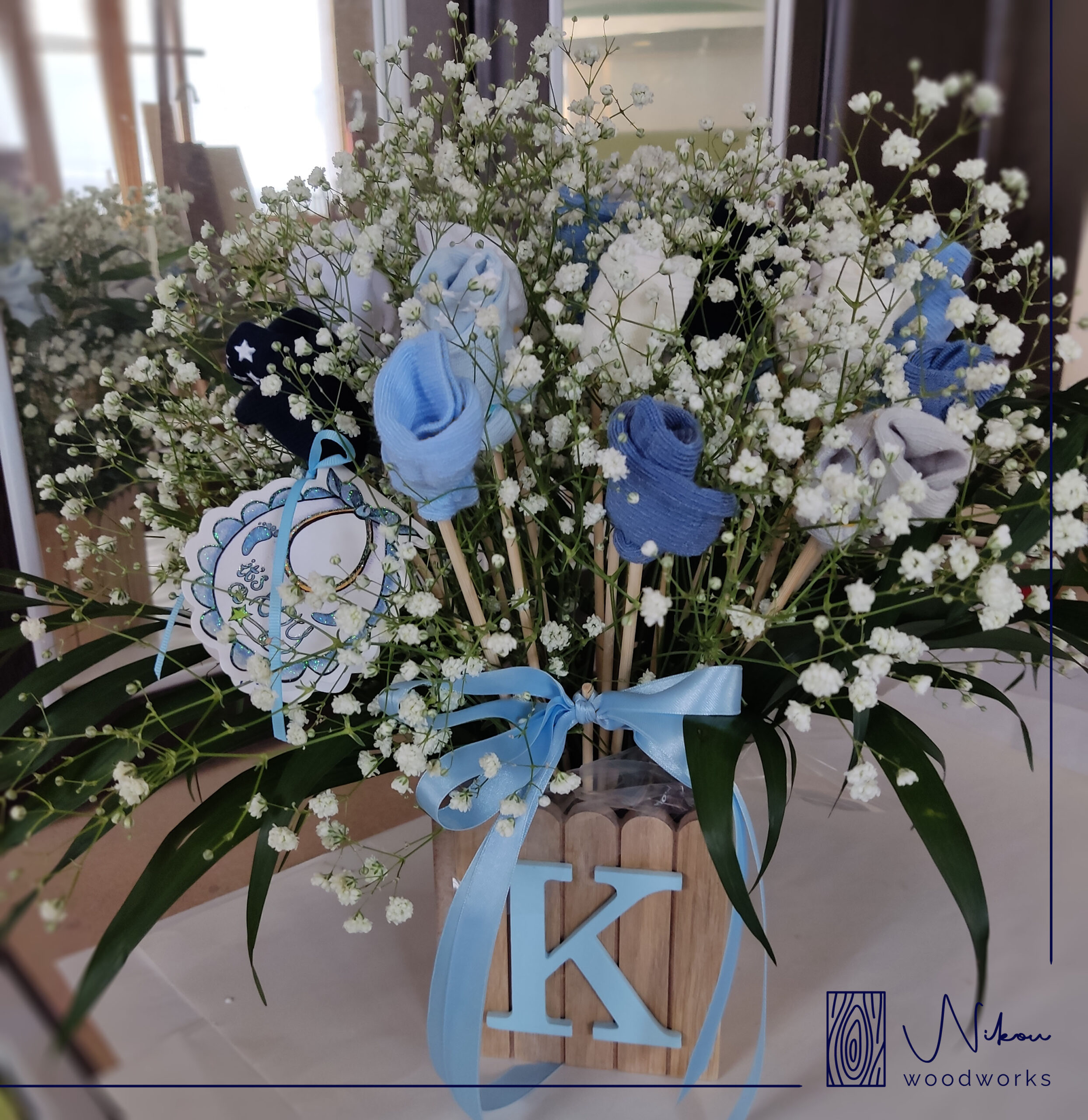 Η τιμή αναφέρεται στην ξύλινη κατασκευή μόνο. Για την σύνθεση με τα λουλούδια-καλτσάκια επικοινωνήστε μαζί μας.