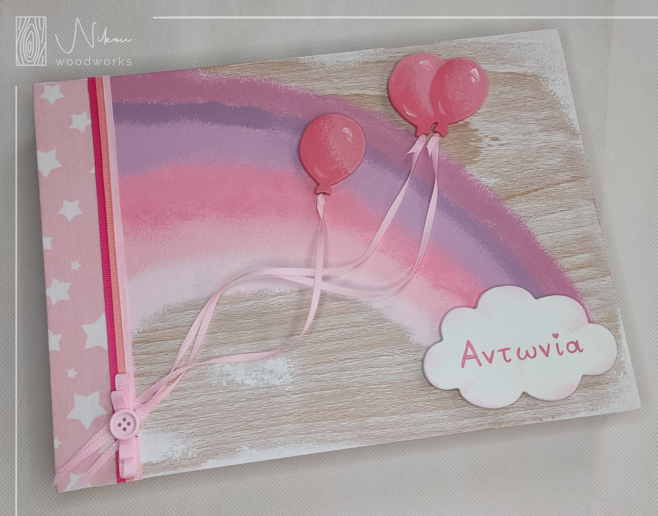 Ξύλινο χειροποίητο άλμπουμ – ευχολόγιο με ουράνιο τόξο, πρόσθετα μπαλόνια και συννεφάκι με το όνομα, όλα ζωγραφισμένα στο χέρι. Τα μπαλόνια πιάνονται με κορδέλα στην άκρη του άλμπουμ με διακοσμητικό φιόγκο και κουμπί. Οι φωτογραφίες τοποθετούνται με ταινία διπλής όψης που σας αποστέλλουμε μαζί με το άλμπουμ.