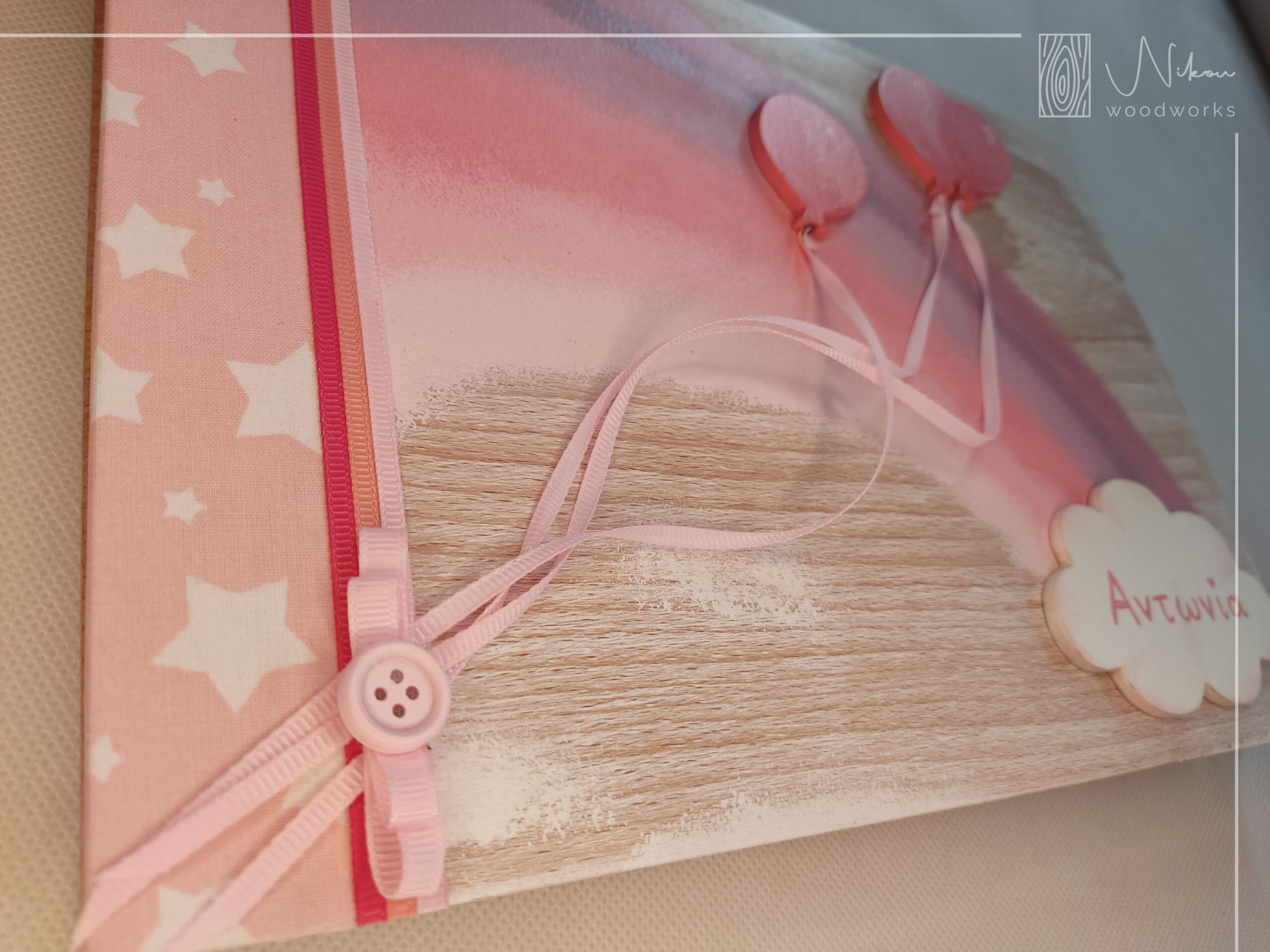 Ξύλινη κορνίζα τοίχου με όνομα και μπαλόνια
