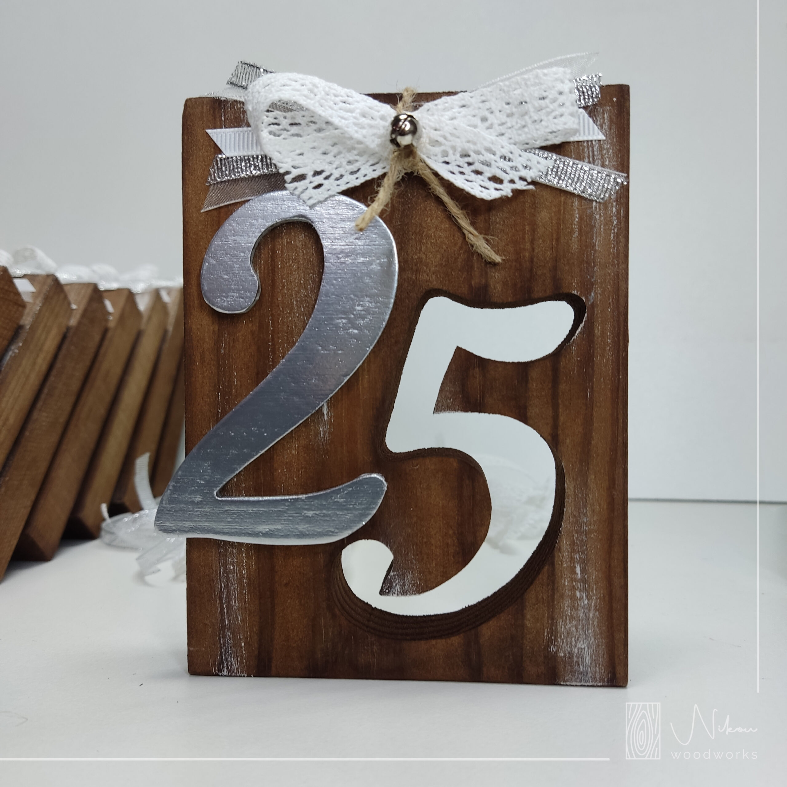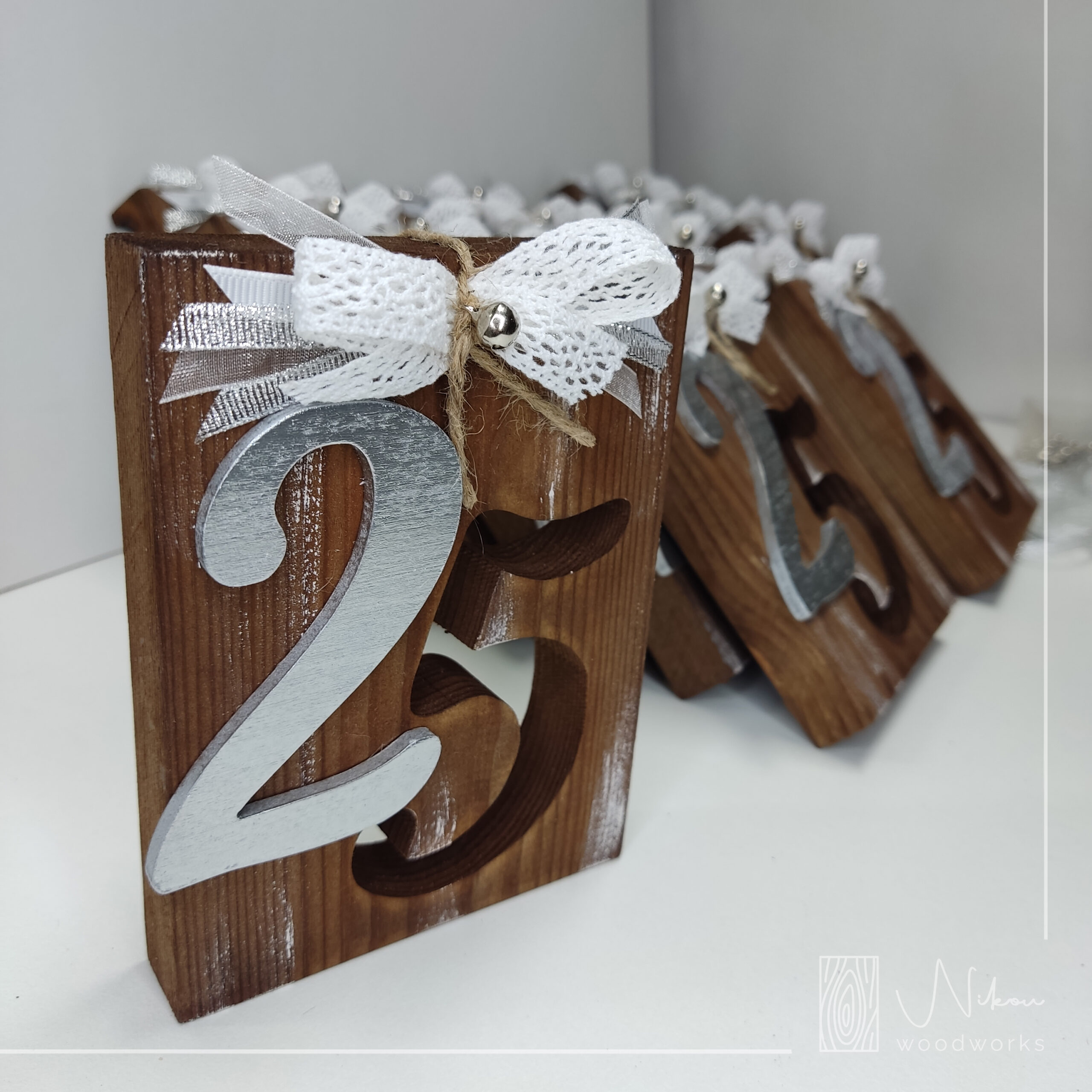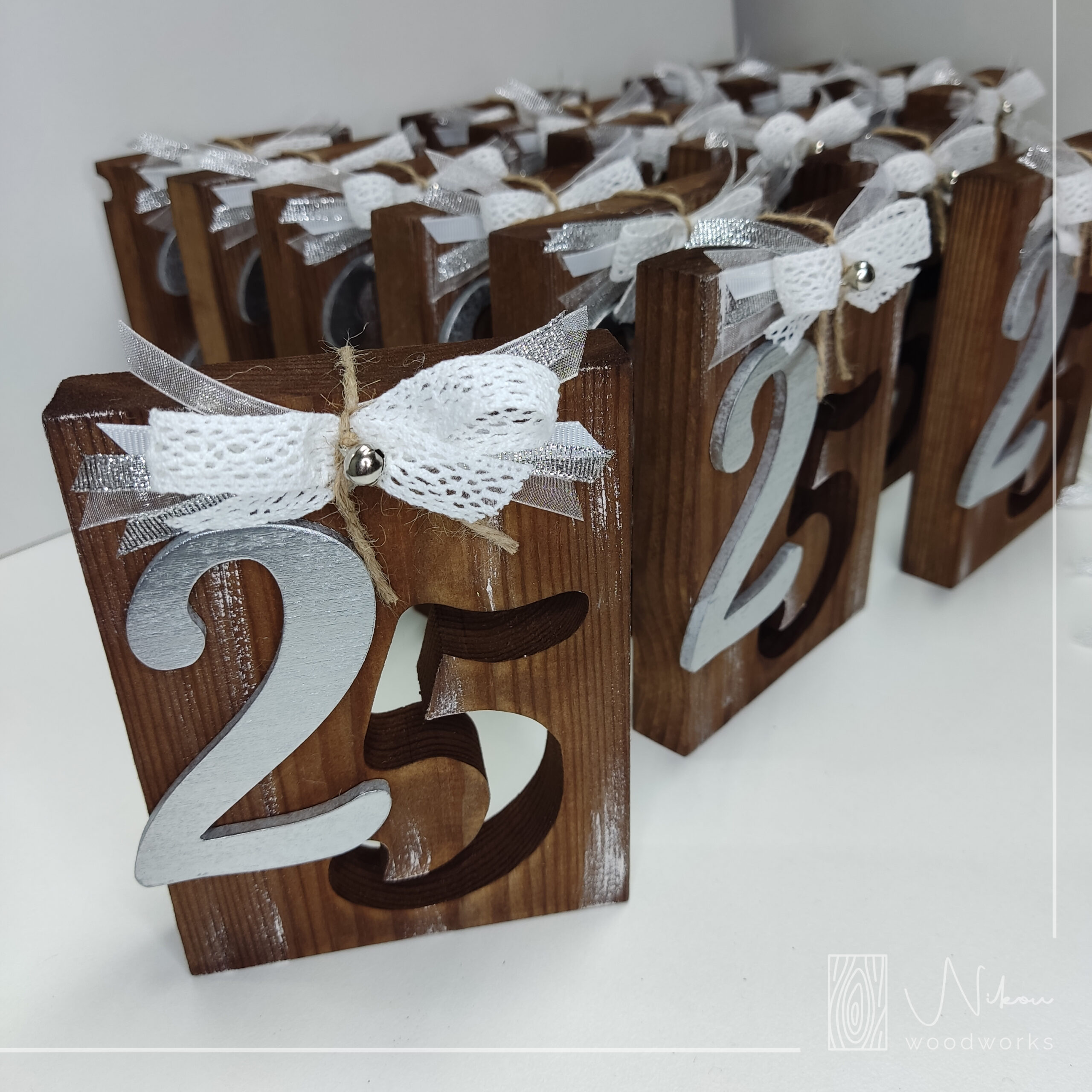 Επιτραπέζιο γούρι 2025. Διάτρητο παχύ μασίφ ξύλο με μεταλλικές λεπτομέρειες, κορδελάκια και κουδουνάκια που στολίζουν την κατασκευή μας!