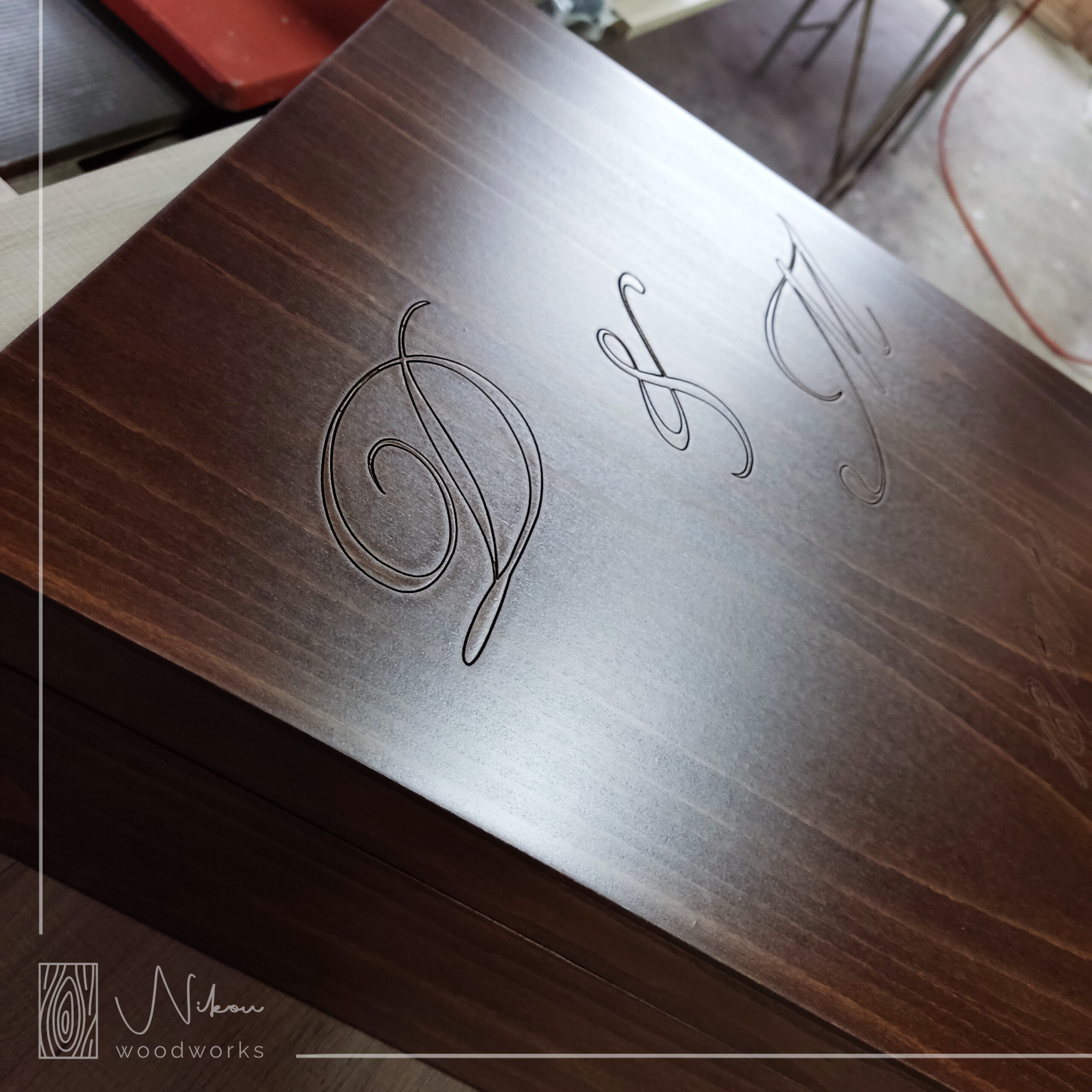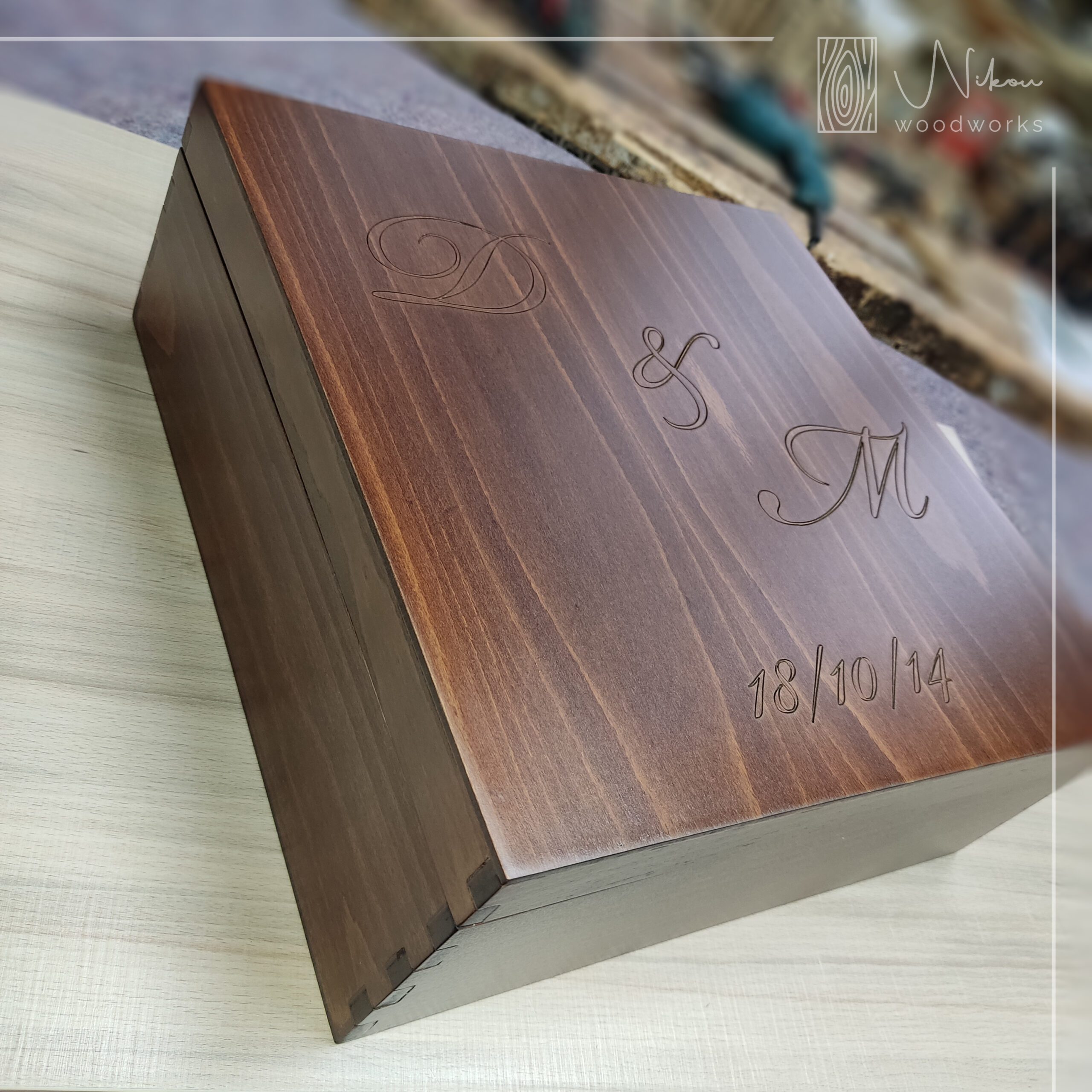 Ξύλινο κουτί για το άλμπουμ και τα αναμνηστικά του γάμου (μπομπονιέρα, προσκλητήριο κτλ.) με ανάγλυφα τα αρχικά και την ημερομηνία γάμου.