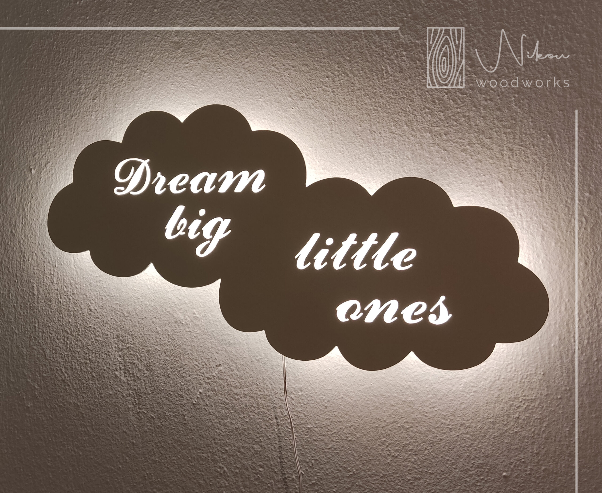 Μοναδικό ξύλινο φωτιστικό τοίχου για διδυμάκια με διάτρητο το ”Dream big little ones” ώστε να διαχέεται καλύτερα το φως.