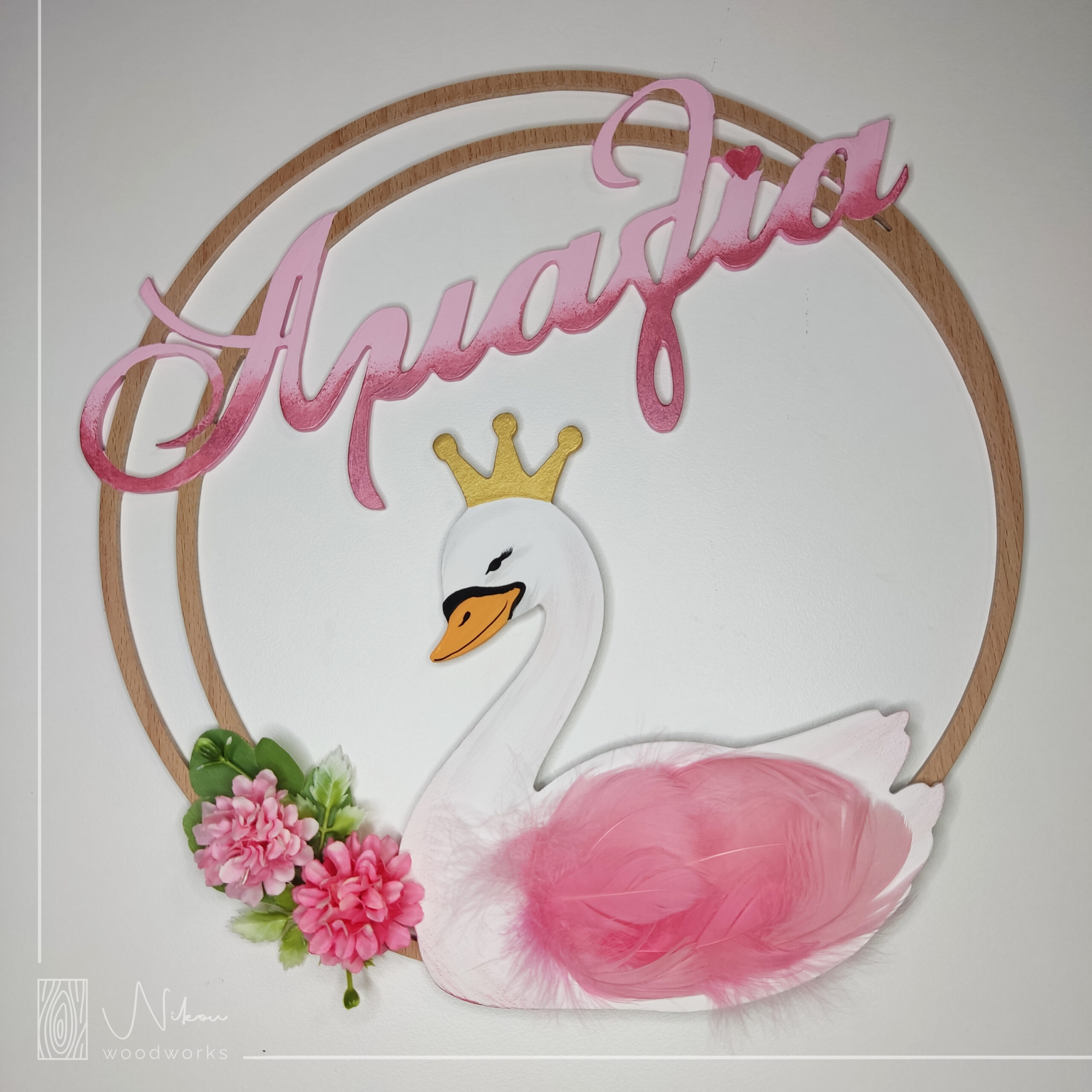 Ξύλινο χειροποίητο διακοσμητικό τοίχου, σε στρογγυλό σχήμα με δίχρωμο το όνομα, στολισμένο με συνθετικά λουλούδια και έναν κύκνο με φυσικά πούπουλα, χρωματισμένα σε απαλό ροζ.