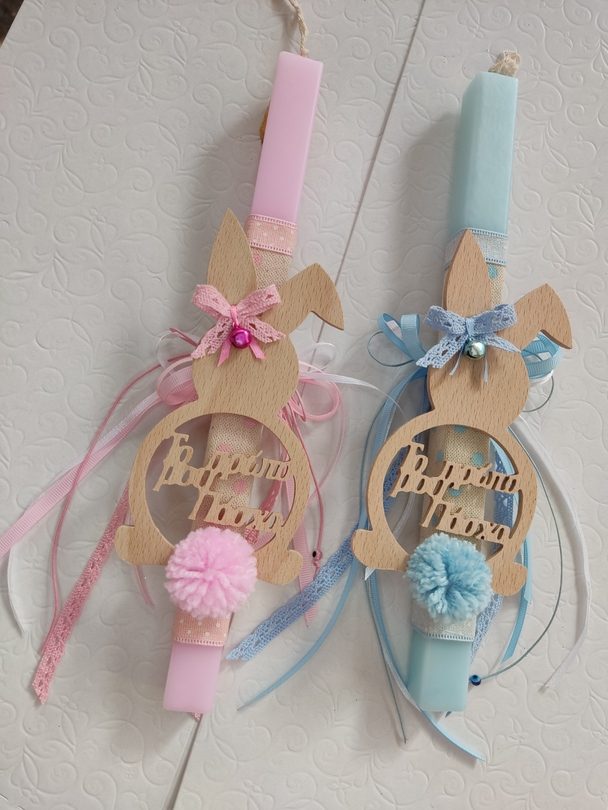 Λαμπάδα λαγουδάκι ” Το πρώτο μου Πάσχα” με χειροποίητο φουντάκι σε τετράγωνη αρωματική λαμπάδα.