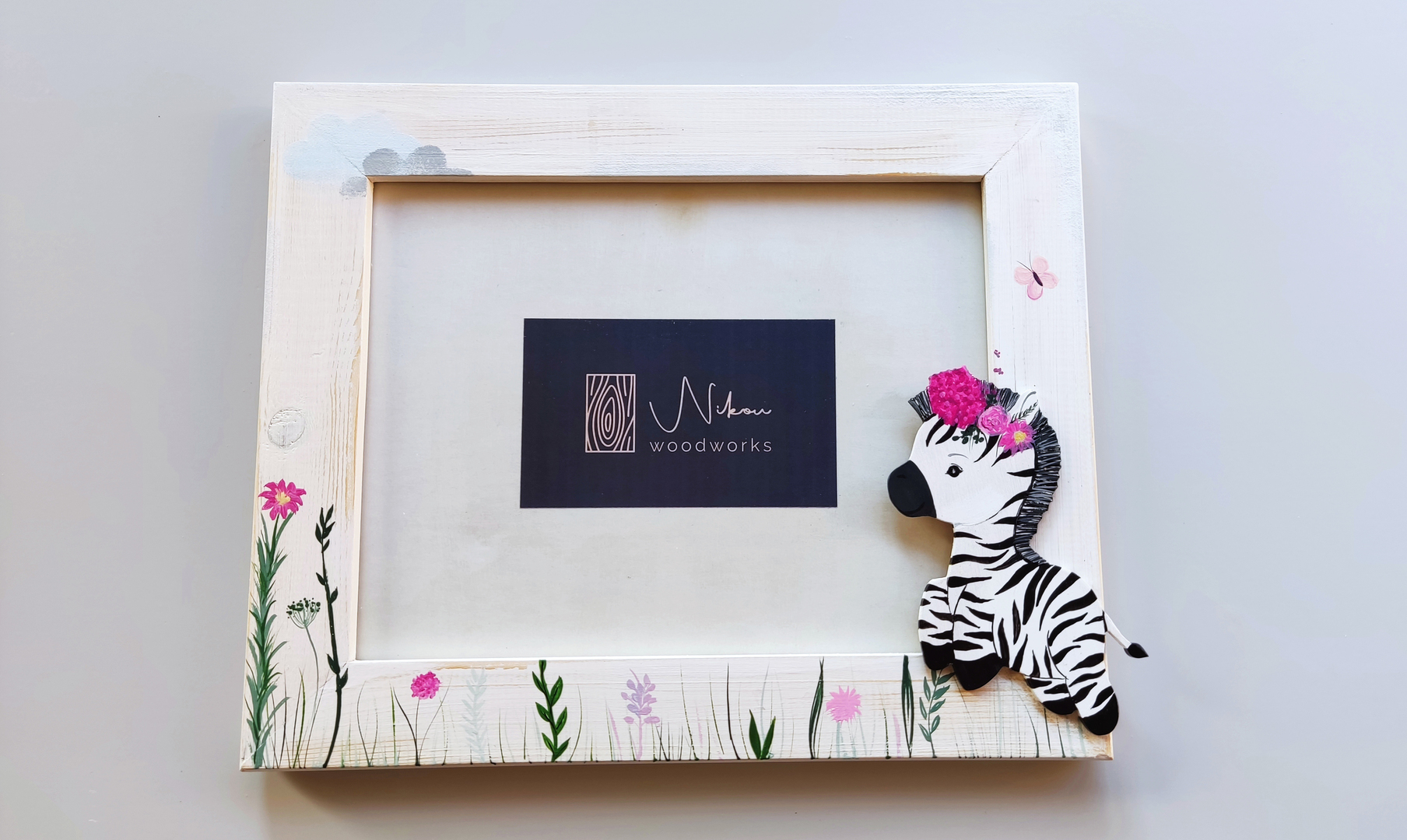 Κορνίζα με ζέβρα και λουλουδάκια ζωγραφισμένη στο χέρι.